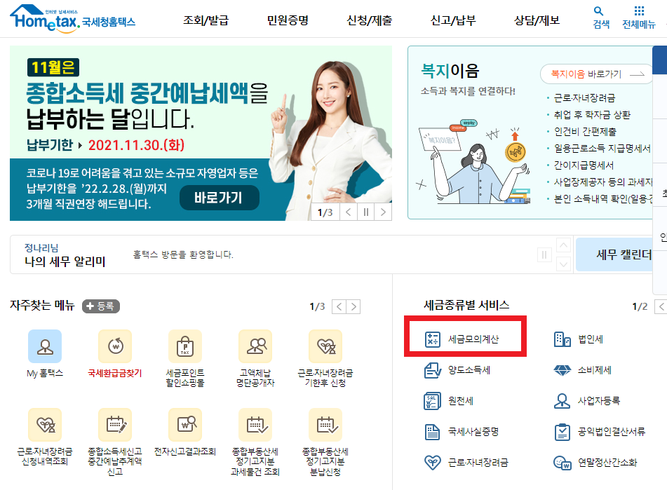 메인 홈페이지 오른쪽 하단에 보면 세금 모의계산이 있습니다. 그쪽으로 들어갑니다.